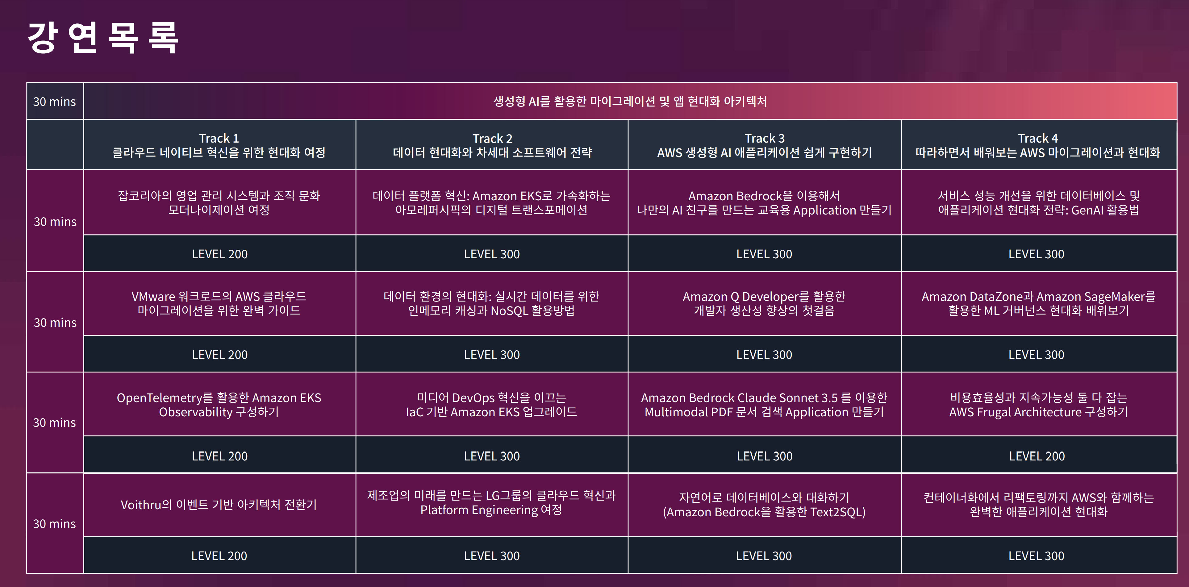 유튜브 개발바닥 채널에서 해당 컨퍼런스에 대한 정보를 알게 되어 등록 신청을 하였고, 4개의 Track 중 평소 관심있던 주제인 Track 1(클라우드 네이티브 혁신을 위한 현대화 여정)과 Track 2(데이터 현대화와 차세대 소프트웨어 전략) 중, 'VMware 워크로드의 AWS 클라우드 마이그레이션을 위한 완벽 가이드', '제조업의 미래를 만드는 LG그룹의 클라우드 혁신과 Platform Engineering 여정', '미디어 DevOps 혁신을 이끄는 IaC 기반 Amazon EKS 업그레이드' 총 3개의 강연을 선택해 들었습니다.